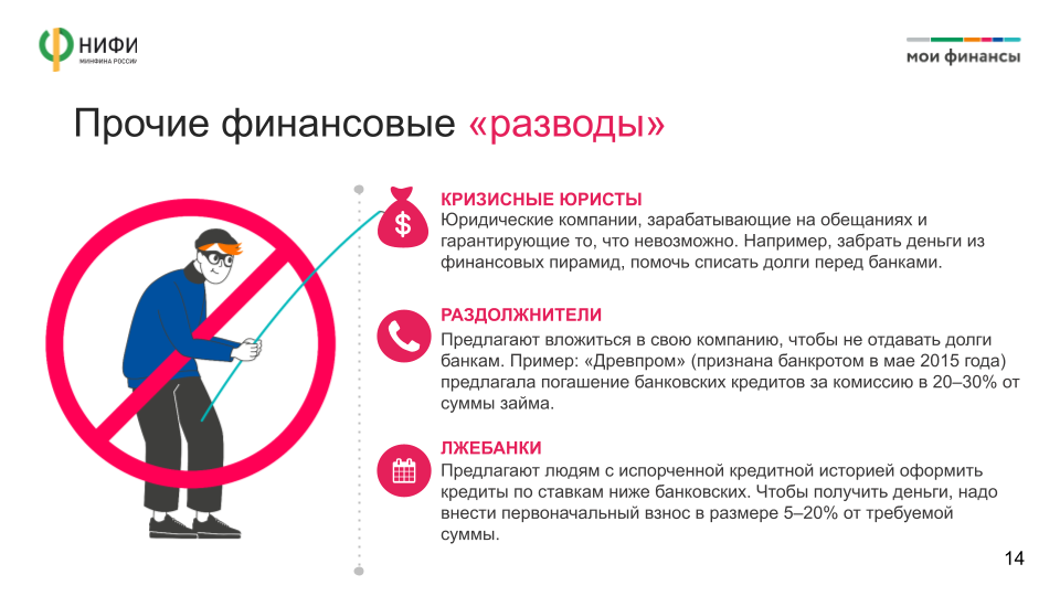 - избежать участия в сомнительных мероприятиях (финансовых пирамидах) на тему «Как стать богатым в одночасье»;